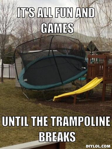 It’s when that justification is weak or too jagged a pill to take that the wheels start to come off of a story. So, it’s that justification that holds things in place around the periphery. Think of a story, or even a specific scene in a book, movie, etc. as a trampoline. The black bouncy part is the scene/story itself while the justifications are like the springs that keep it all in place. In the case of World War Z, it feels like not enough thought was given to the periphery of that particular scene, and so my suspension of disbelief came crashing down just like I had hopped on a trampoline with only a fifth of its springs.