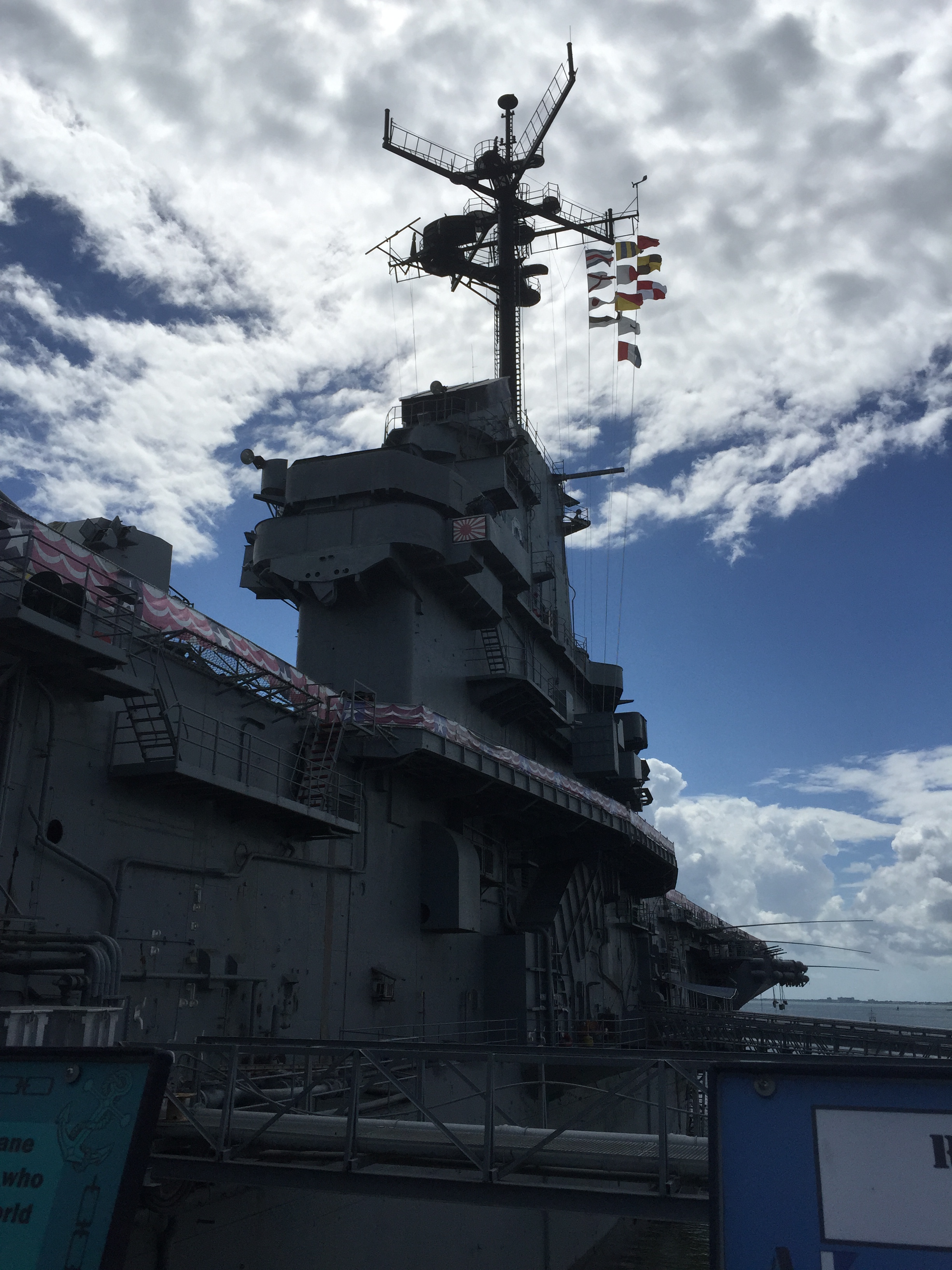 But on the other hand, she’s warship who will never see active duty again. Once she was one of the mightiest vessels on the ocean, and now bored teenagers scratch their initials into her paint. There is a movie theatre built into the forward part of her aircraft hangar and a cafeteria built into the aft. While she needs the touristy stuff (like the gift shop) to sustain herself, it strikes me as a little sad that she’ll never sail again.
