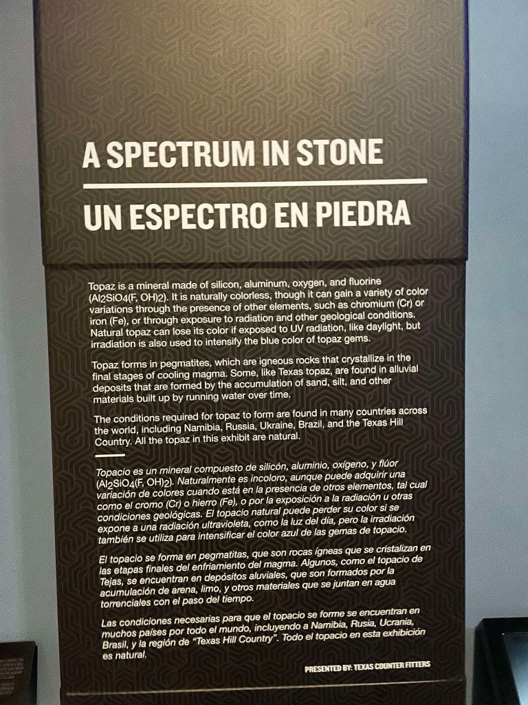 If you’ve followed this blog for any length of time, you likely know that museums are one of my passions. I regularly travel to museums across the U.S. with my family. Well, a new exhibit just opened a few weeks ago at The Perot Museum of Science and Nature in Downtown Dallas, Texas, called Topaz: A Spectrum in Stone. The reason I’m writing about it today is two-fold: First, it’s really cool, and the Perot has a stunning Gem & Mineral Hall; and two, I was a writer on this exhibit. (I even gave the exhibit its name.)