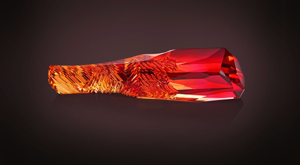 Remember all that stuff about chromium above? Well, this topaz is one of the best examples of a fiery red-orange color. It was mined in Brazil and cut to have a stylized flame pattern along its surface. The Imperial Flame topaz is one of the best examples of this rarest-of-the-rare topaz in the world.